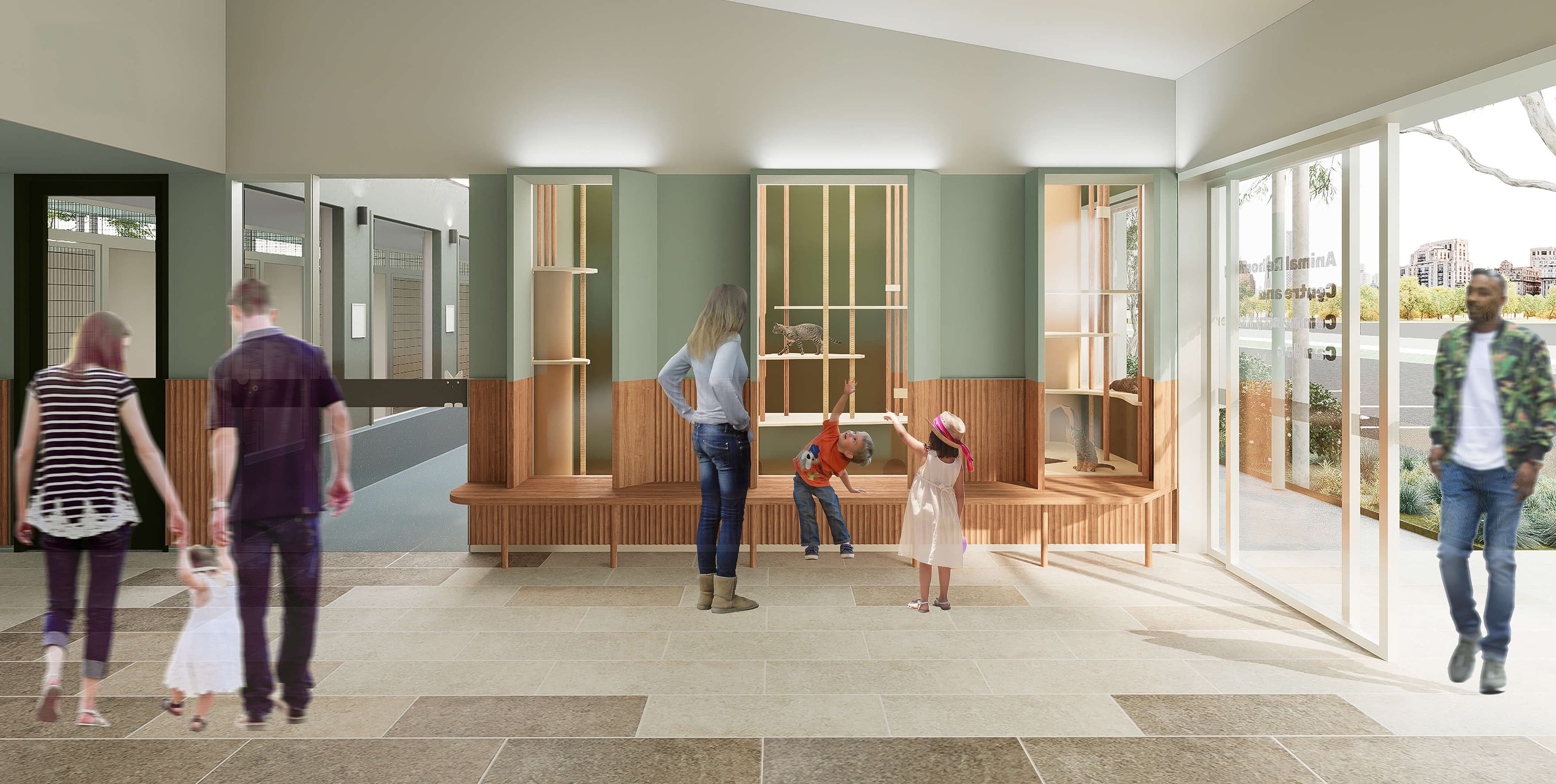 Three connected buildings are configured in a “U” shape around an internal landscaped area containing exercise yards. At the front, a generous reception area includes public amenities, staff facilities, viewing rooms, and a multipurpose function space for community outreach and education. Inside, robust finishes are softened by warm timber accents, thoughtful acoustics and playful nooks for animals and humans.