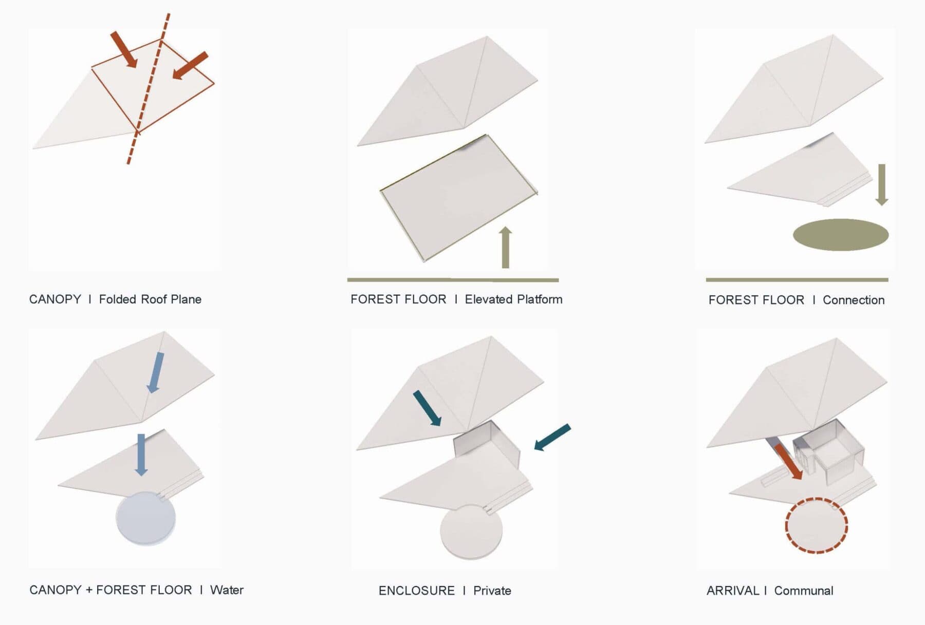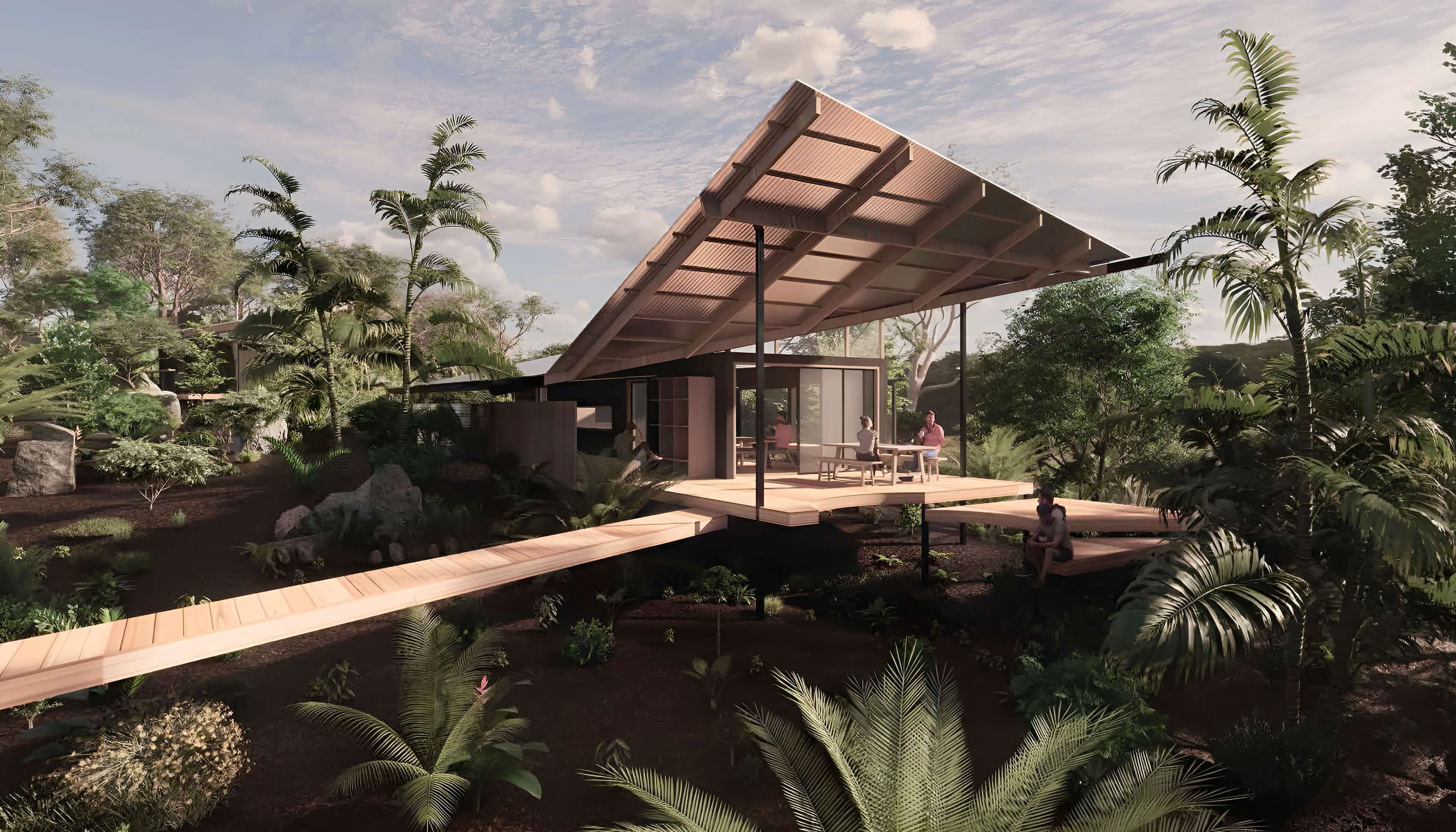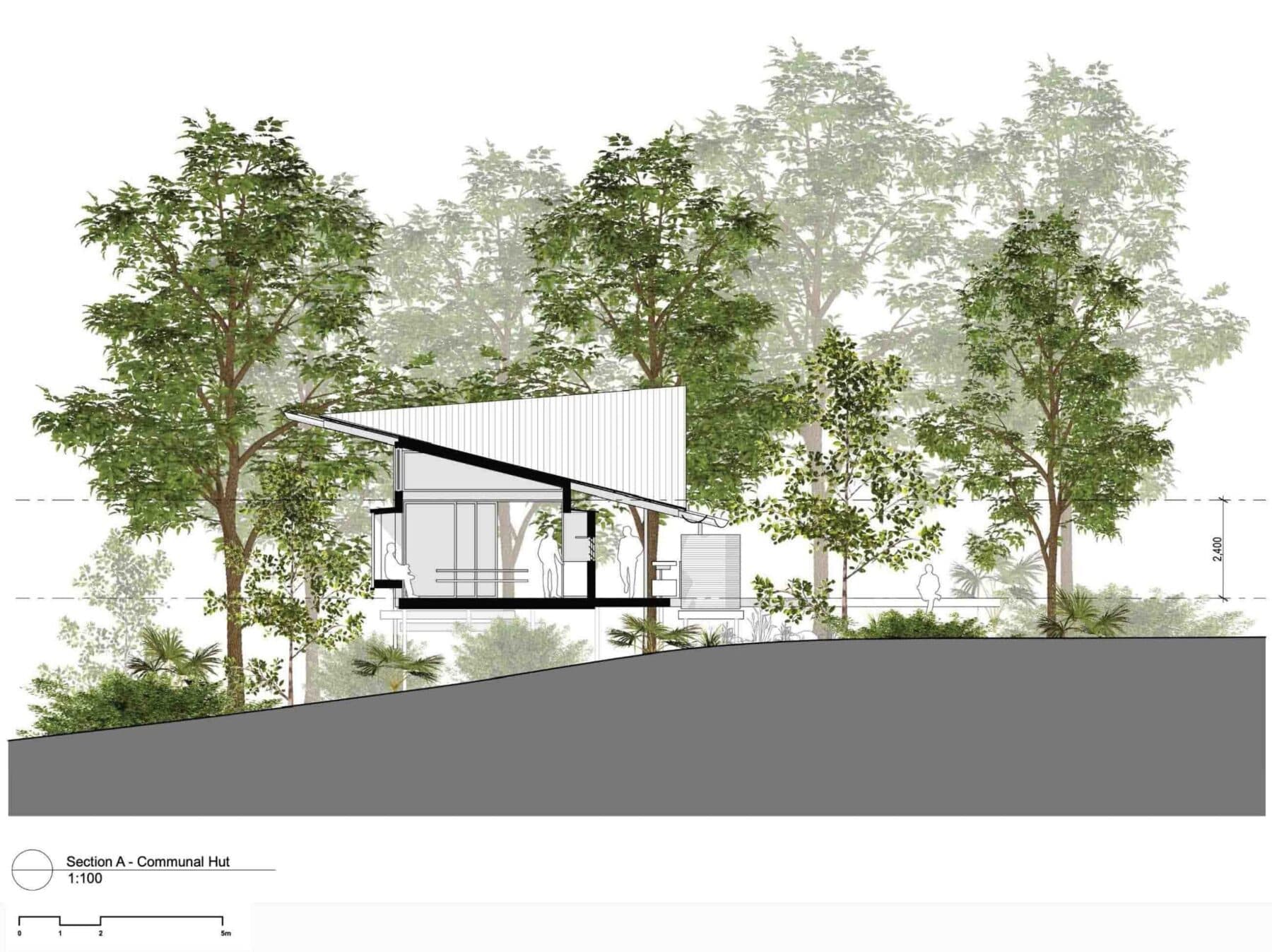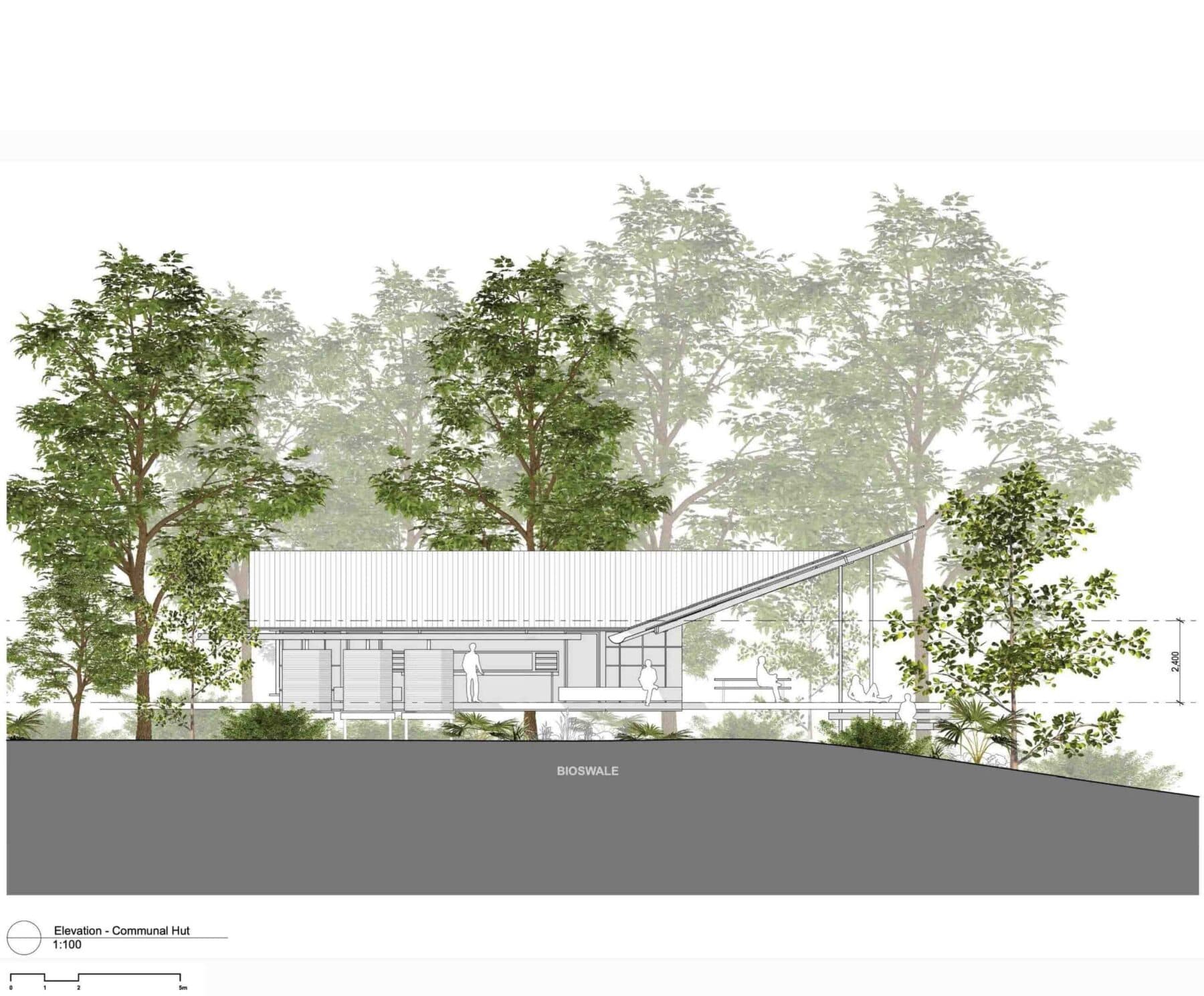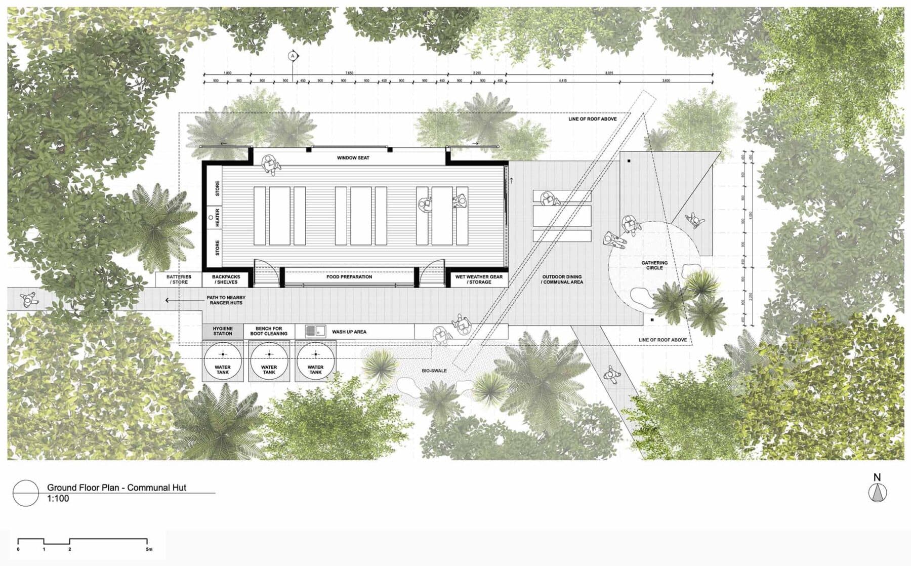 A communal structure houses dining, cooking and relaxing zones and features a bio-swale and gathering circle under the folded canopy, tiered timber observation platforms, and large sliding doors and fly-screened enclosure for engagement with the landscape. The steep valley-shaped roof takes its cues from leaf structure, redirecting water to rainwater tanks and bio-swales.