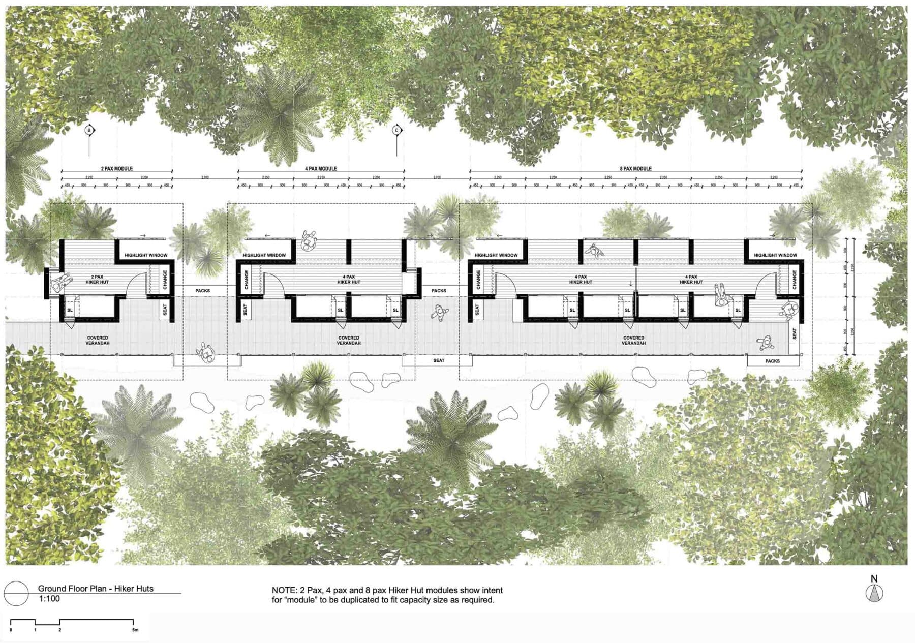 A cluster of modular prefab hiker huts nestles in the rainforest landscape. Tourism infrastructure protects and educates in this remote, constrained and precious site.