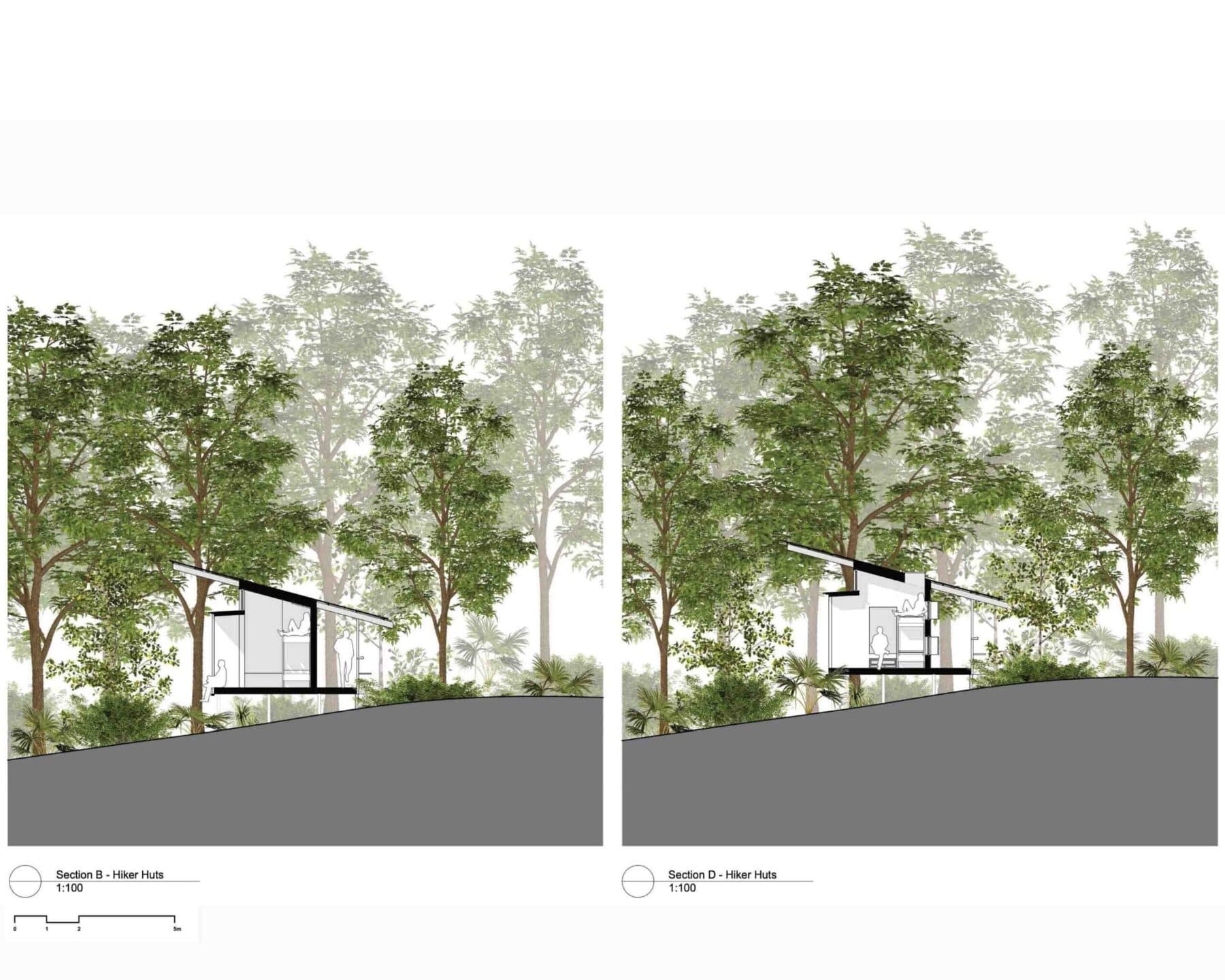 Various apertures – skylights, clerestory windows, flaps – allow hikers look out at views to the forest floor, under-storey, canopy and night sky, connecting the sleeping quarters to the landscape beyond.