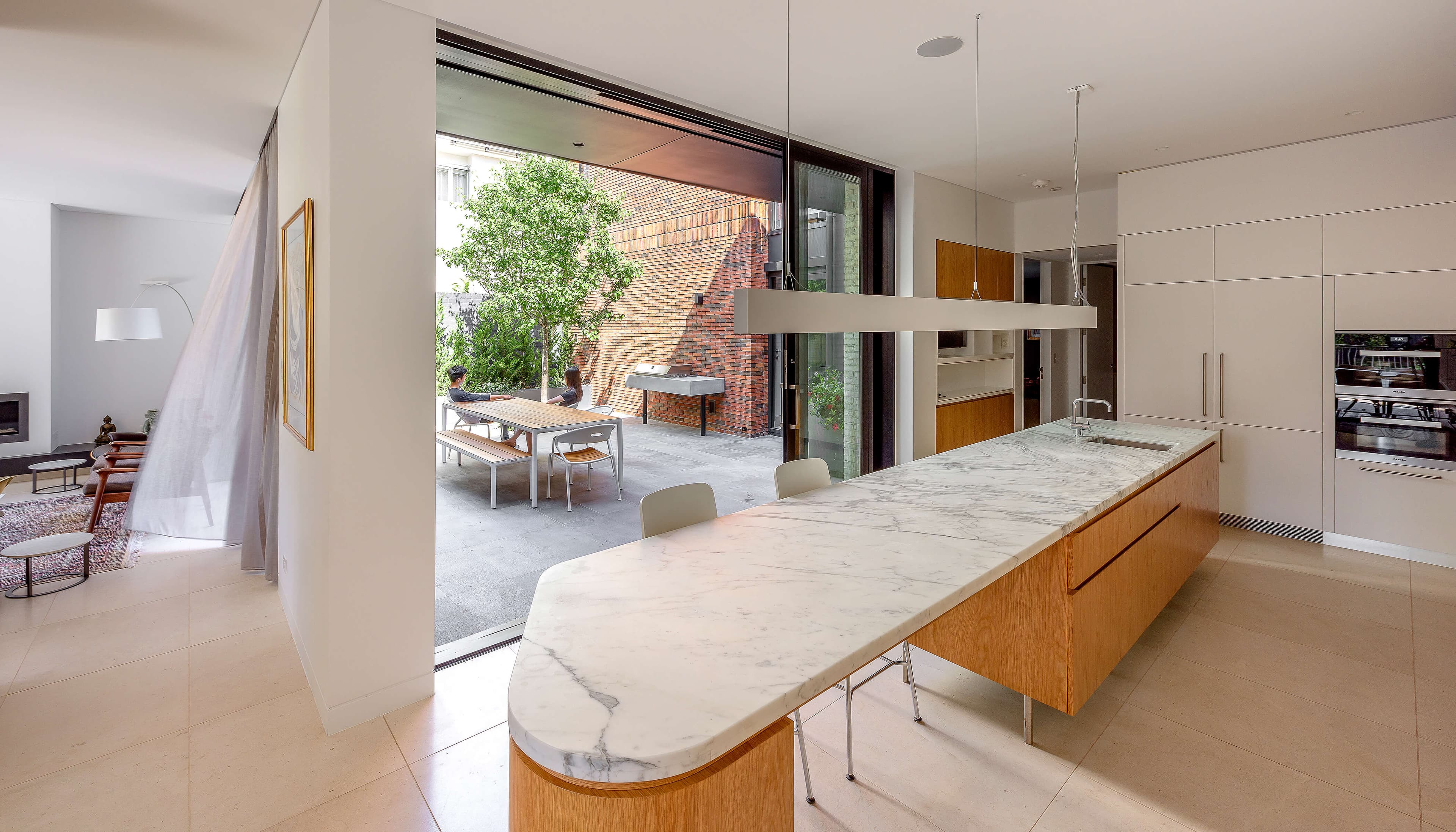 Bedrooms are located on the street level while the lower ground level contains the living, kitchen and dining rooms. These rooms open to both the central courtyard, and the rear garden and pool.