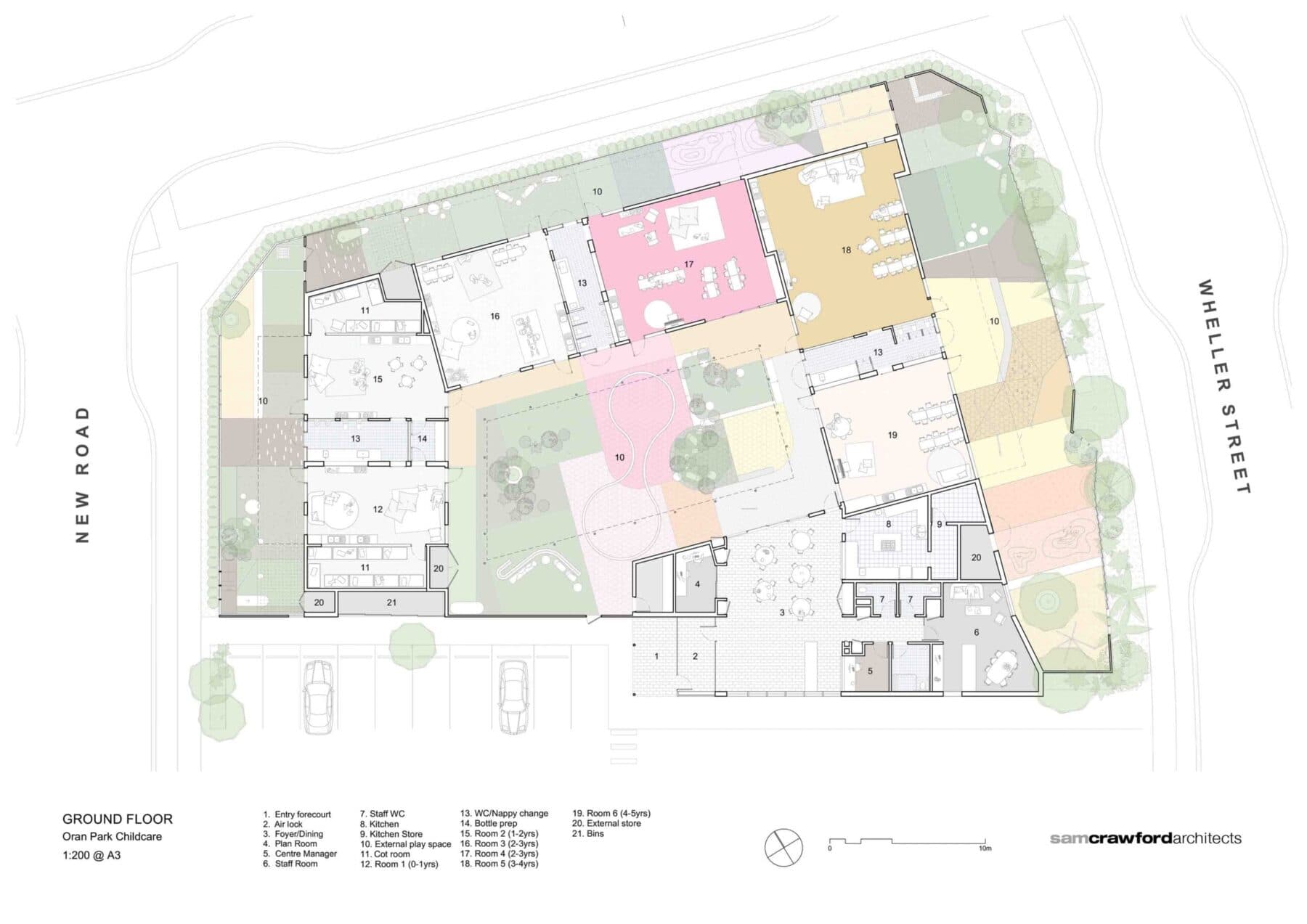 The single-storey design respectfully responds to its residential context while establishing a meaningful dialogue with the expansive new park across the road. This strategic positioning creates opportunities for the centre to extend its educational reach into the broader landscape, reinforcing connections between structured learning and natural discovery.
