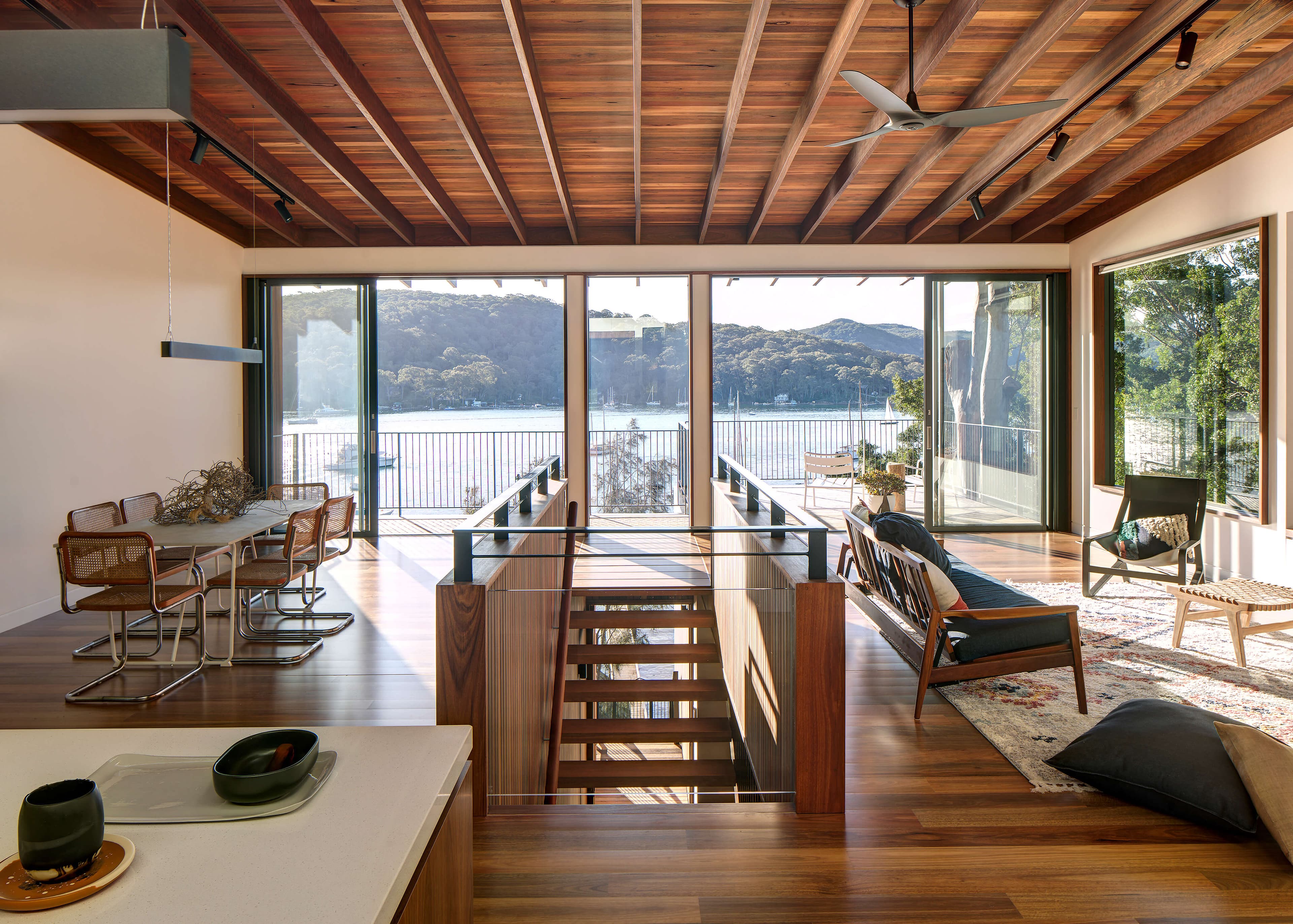 Dark and muted timber cladding allows the building to visually nestle into the tree-covered hillside, moderating the impact of the building within the natural setting of the island and when viewed from Pittwater. A timber path and stair leads from the private jetty to the house.