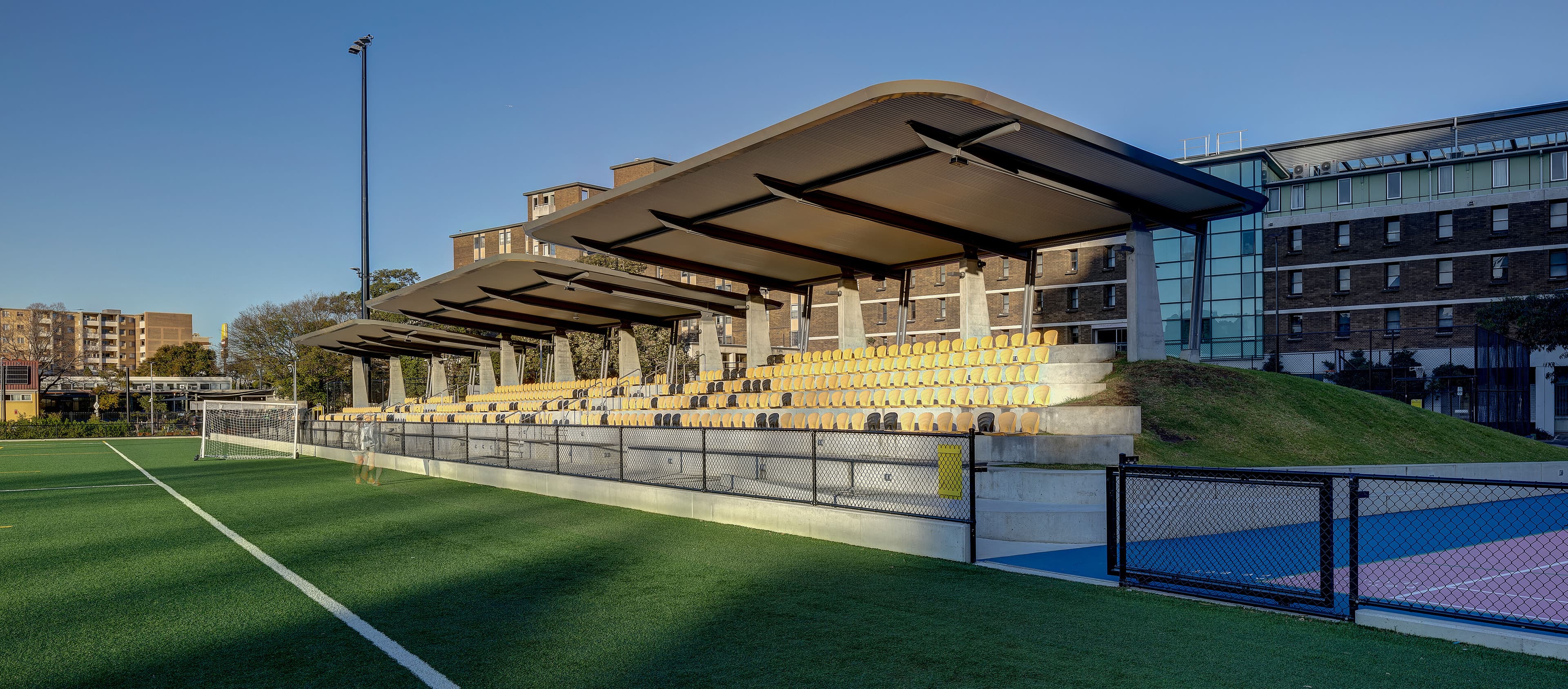 Our role was to assist in review of the masterplan, and design and delivery of three key elements – design of a new spectator grandstand overlooking the main sports field, design of upgrades to the sports amenities pavilion, and design of a new social hub for the precinct.